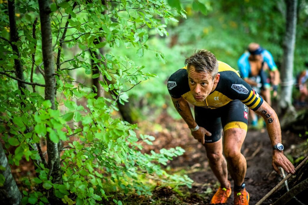 Het loopparcours gaat richting het zuiden langs het meer. Behoorlijk wat stukken waar je goed snelheid kunt maken: over het strand, stukje asfalt, gravelwegen. En single tracks die speciaal voor deze wedstrijd zijn gemaakt. Enkelbrekers, waar je je soms via touwen naar boven moet trekken. Zeker als het nat en modderig is. Met droog weer kun je met wegschoenen uit de voeten, maar met een beetje regen is het eigenlijk gelijk: trailschoenen. Het aantal hoogtemeters valt eigenlijk wel mee, maar ze zitten allemaal bij elkaar op de helft van de twee rondes. En na 32K mountainbiken valt dat eigenlijk toch niet mee.